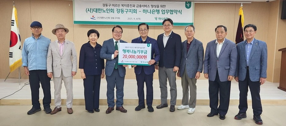대한노인회 서울 강동구지회(지회장 김성태)는 9월 4일 지회 2층 강당에서 하나은행과 업무협약을 체결하고, 지역 어르신의 복지 증진 및 금융서비스 향상을 위한 공동 협력체계를 구축하기로 했다.
