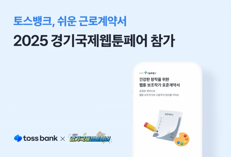 토스뱅크가 웹툰 보조작가를 비롯한 창작자들에게 '쉬운 근로계약서' 서비스를 직접 알리고 공정한 계약 문화 확산을 위해 '2025 경기국제웹툰페어'에 참가한다고 19일 밝혔다.