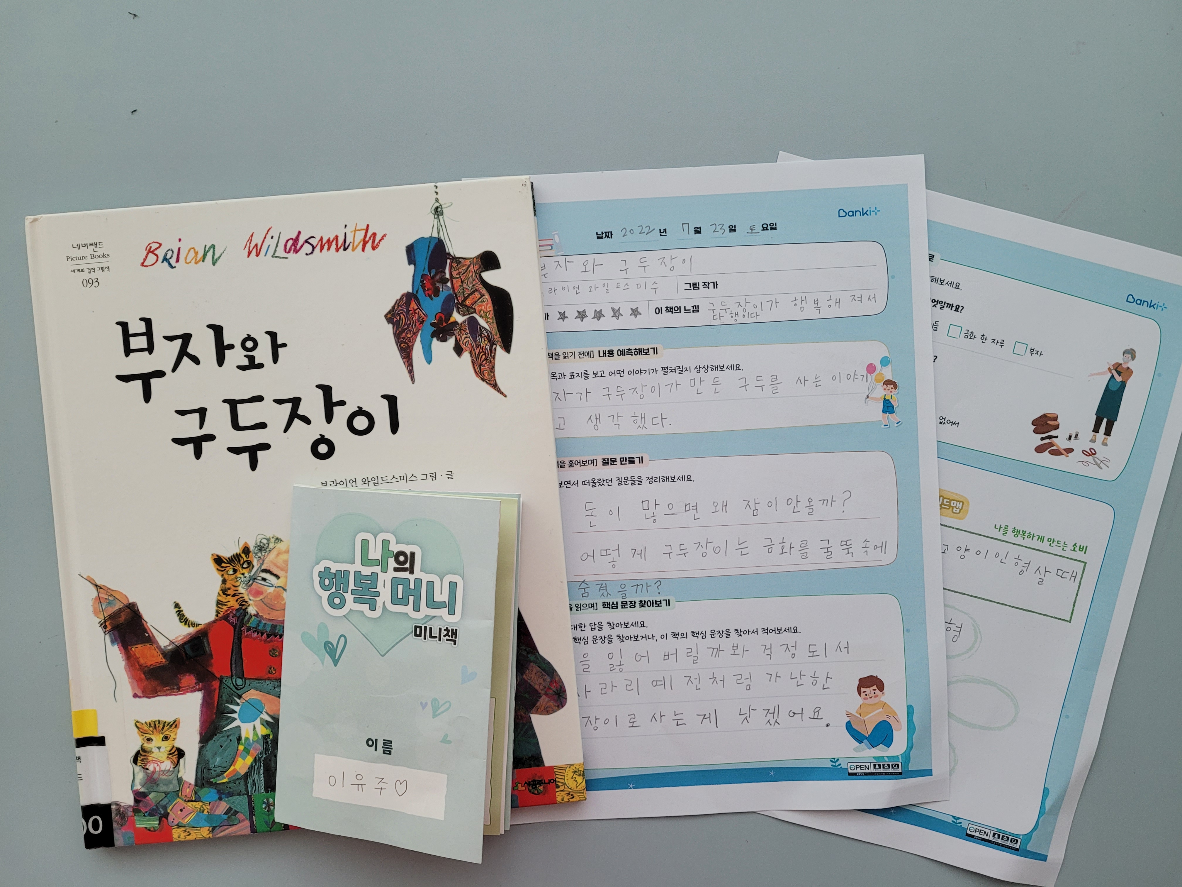 돈이 얼마가 있으면 좋겠냐는 선생님의 물음에 5만원이라 답하는 딸의 소박함도 보았고요, 돈 걱정에 잠 못 이루는 부자보다는 행복한 구두장이가 되고싶다는 딸의 순수함도 알 수 있는 시간이었어요.