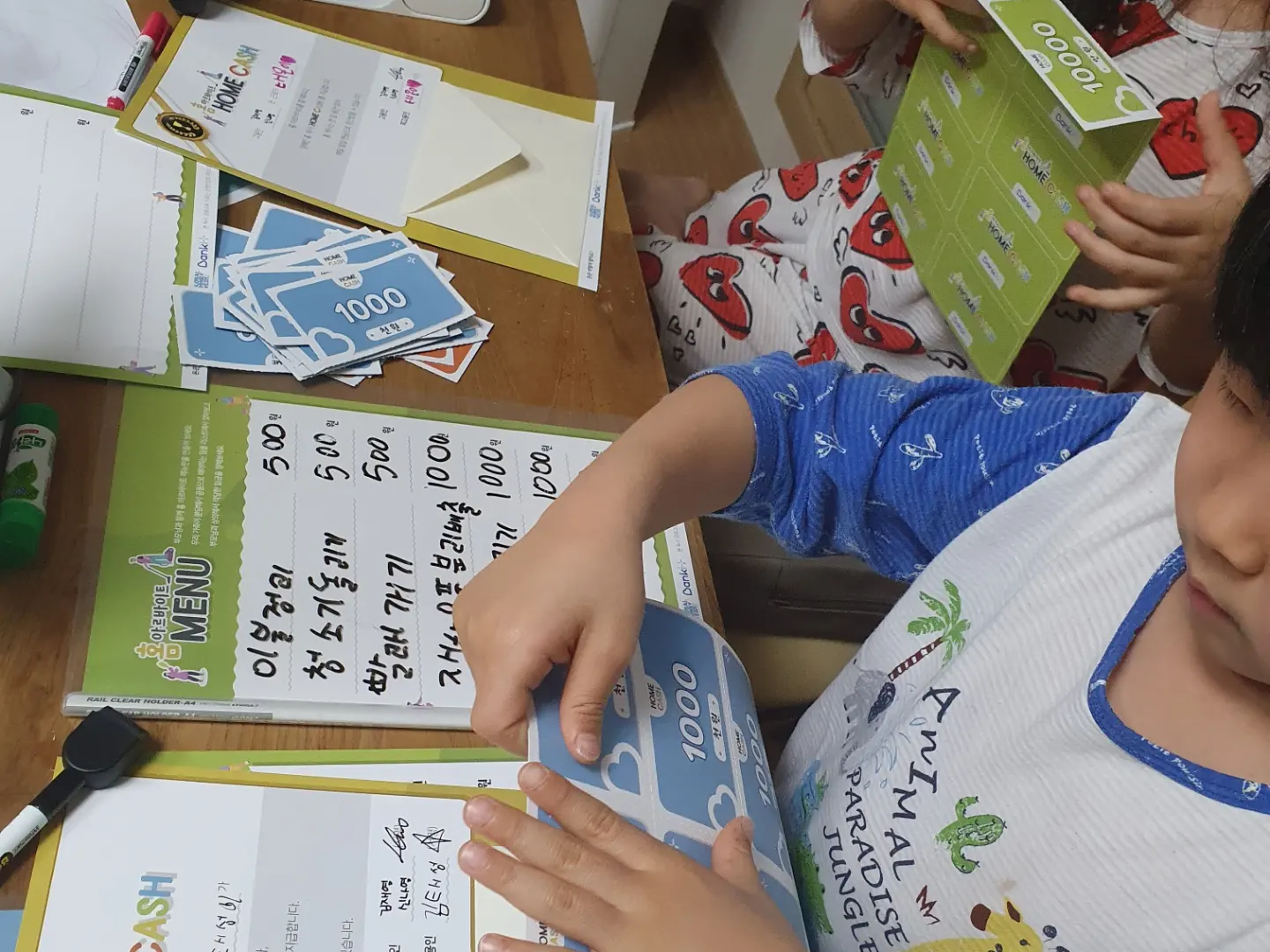 나눠주신 키트도 예술👍아이들이 너무 신나했어요 자기들이 아르바이트를 하며 직접돈을벌어 원하는걸 살수있다니 그때부터 살물건을 계속 읊기시작하네요 ^^ 이젠 자기들이 적어놓은 홈아르바이트내역보고 스스로 찾아서 한답니다~~ 너무 뿌듯하고 신청하고 강의듣길 잘한것같아요