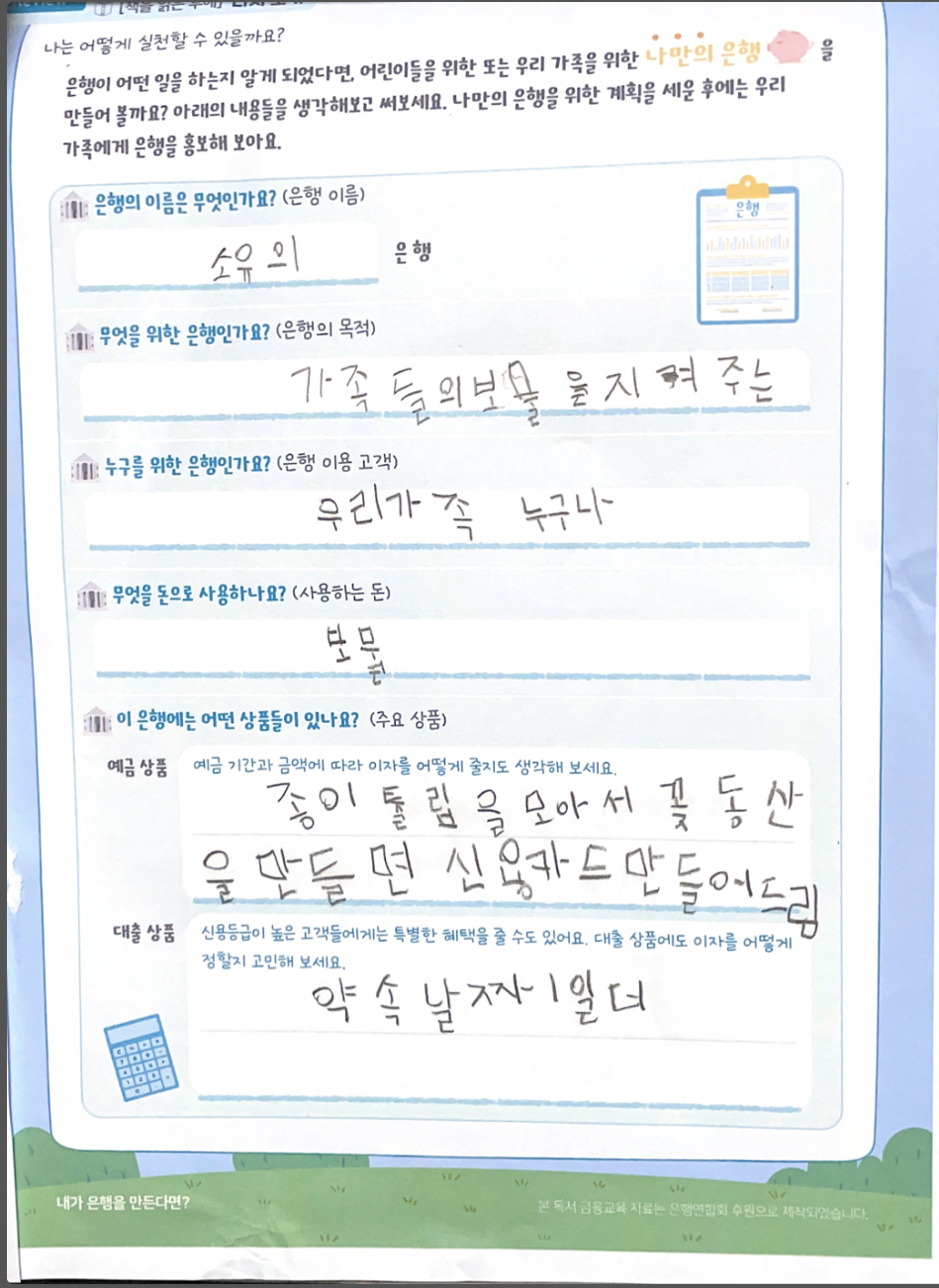 매 번 아이에게 신용 카드로만 결제하는 모습을 보여주다보니 돈에 대한 실체감이 없어서 돈이 무엇인지 조차 궁금해하지 않는 것 같았는데 지난 달 금융독서활동 시작한 후론 돈의 존재와 소중함에 대해 느끼고 있는 것 같아요~