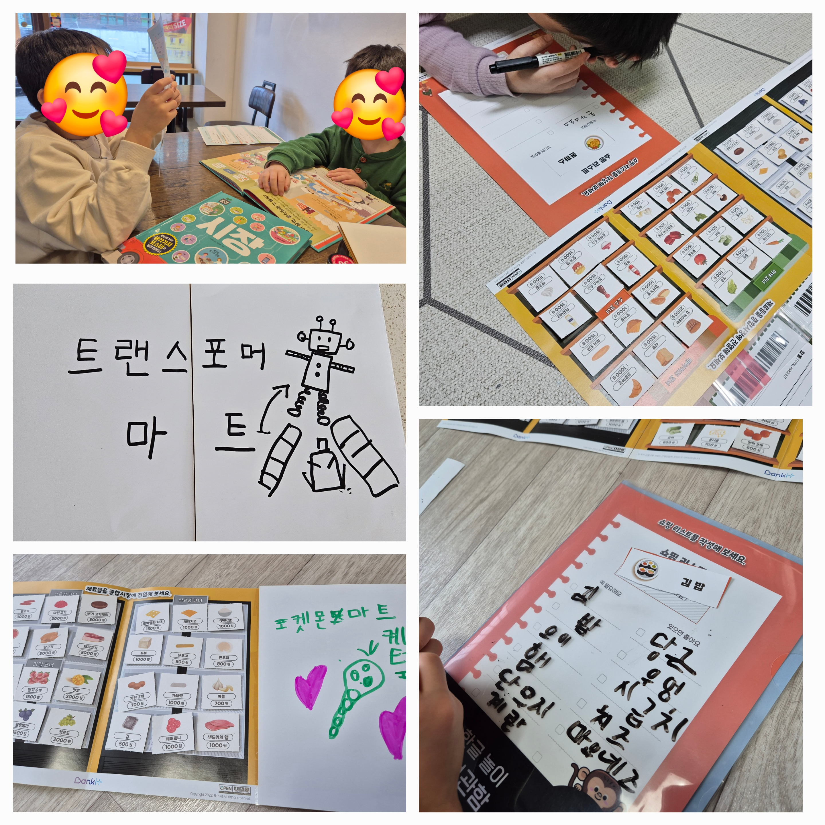 마트의 어떤 코너에 식재료가 있는지 이야기하며 분류해보고, 내가 만들고 싶은 메뉴를 선정해 그 메뉴를 만들기 위해 필요한 식재료를 직접 만든 카트에 담아 계산하고, 영수증도 만들었습니다. 평소 마트놀이를 집에서 많이 하다보니 금전출납기와 가짜 장난감 돈도 있어서 꽤나 그럴 듯한 놀이가 되었어요.