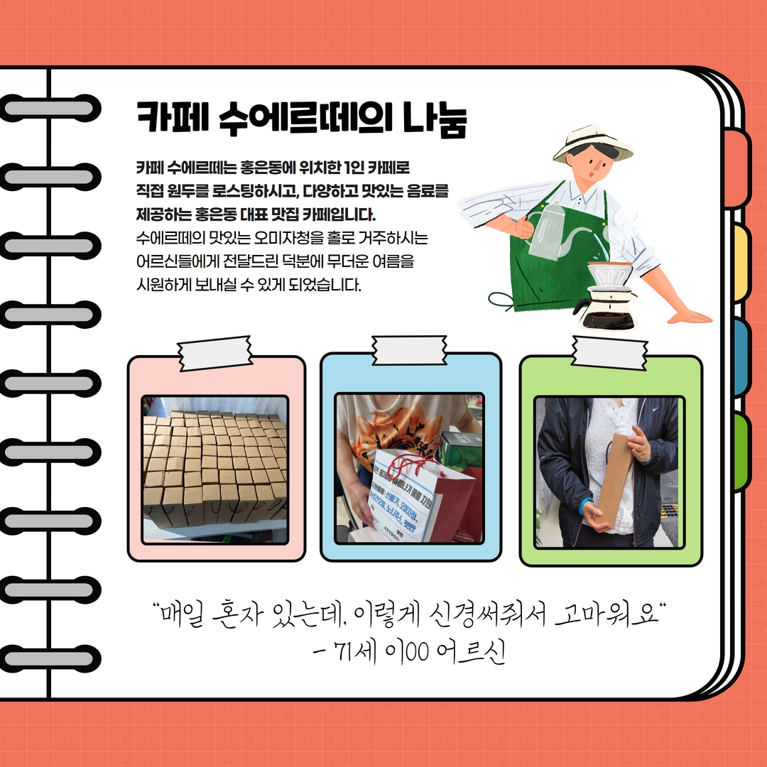 카페 수에르떼와 함께 어르신들을 위한 여름나기 오미자청 나눔을 진행하였습니다.