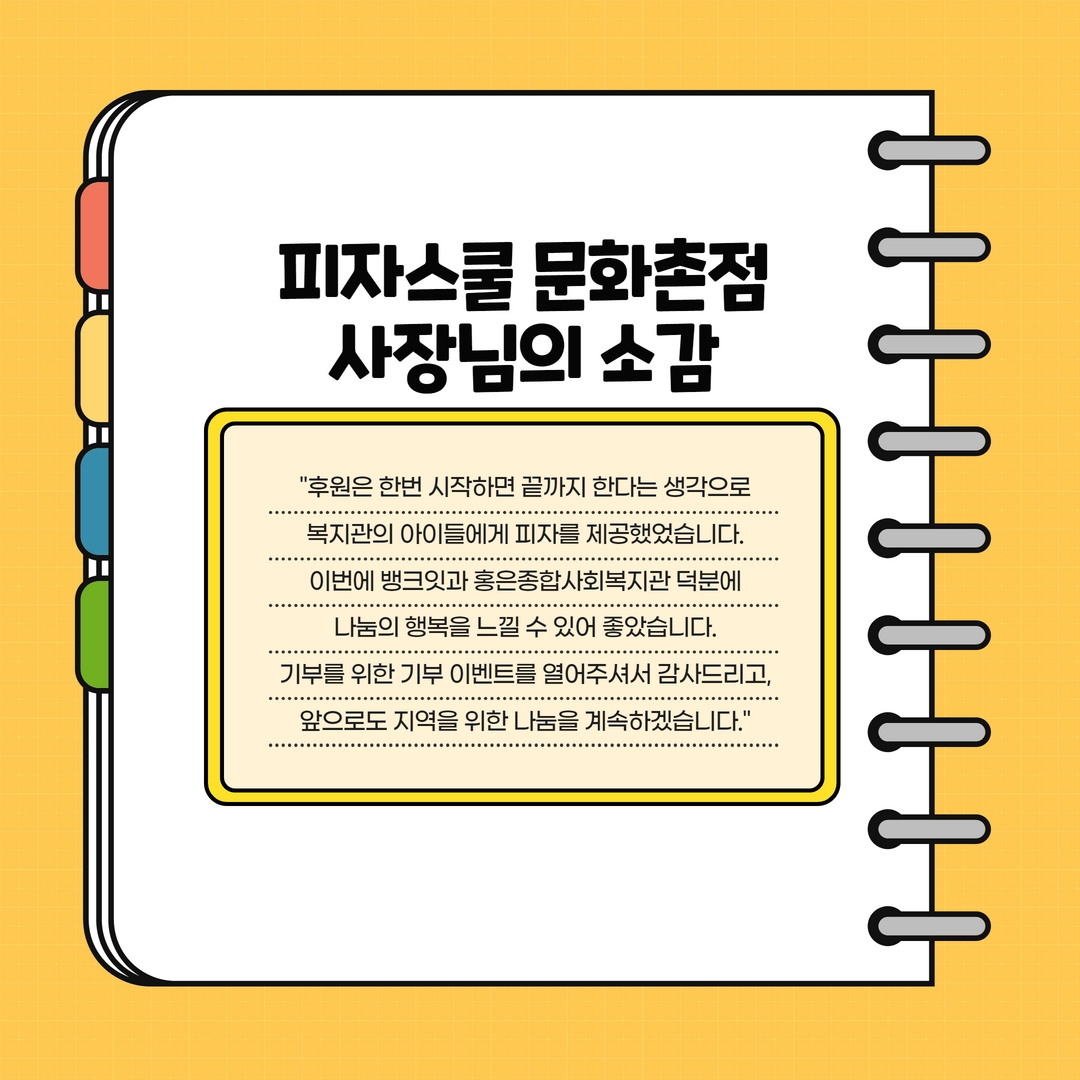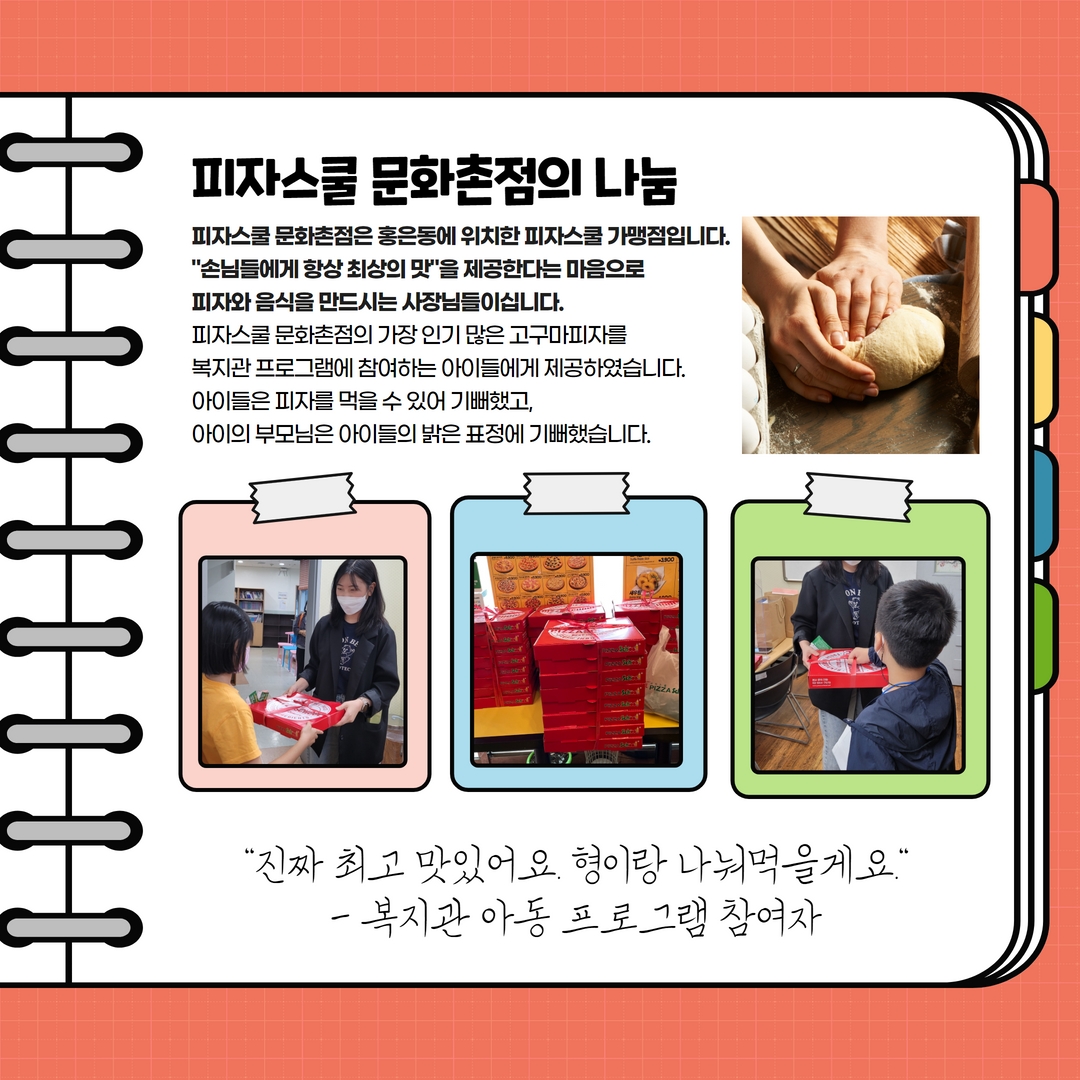 “기부를 위한 기부” 프로그램으로 피자스쿨 문화촌점과 함께 아이들을 위한 피자 나눔을 진행하였습니다.
