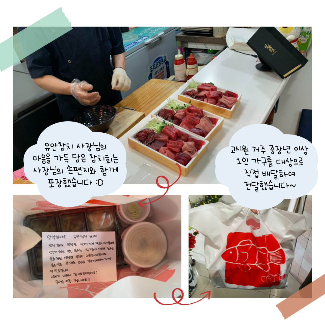 참치회를 전달 받은 당사자들은 "참치를 처음 먹어보는데 정말 맛있네요", "지금까지 혼자라고 생각했는데 아주 가까운 곳에 이렇게 나눠주시는 곳이 있어서 정말 감사한 마음입니다" 등의 의견을 나눠주었습니다!