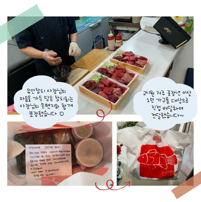 본 사업을 함께 진행한 유안참치 사장님도 "주위를 살펴보면 소외된 지역주민이 많이 있다는 것을 느꼈습니다. 직접 참치를 가지러 오신 분께서 특별한 음식을 제공해주는 것만으로도 너무 감사하다고 하였는데 더 많은 기부를 하지 못함에 죄송했습니다. 소중한 격려의 말씀에 코로나로 어려운 일이 모두 사라지는 것 같았습니다"라며 "앞으로도 꾸준히 지역주민을 위해 나눔과 기부를 실천하겠습니다"라고 말씀해주셨습니다. :)