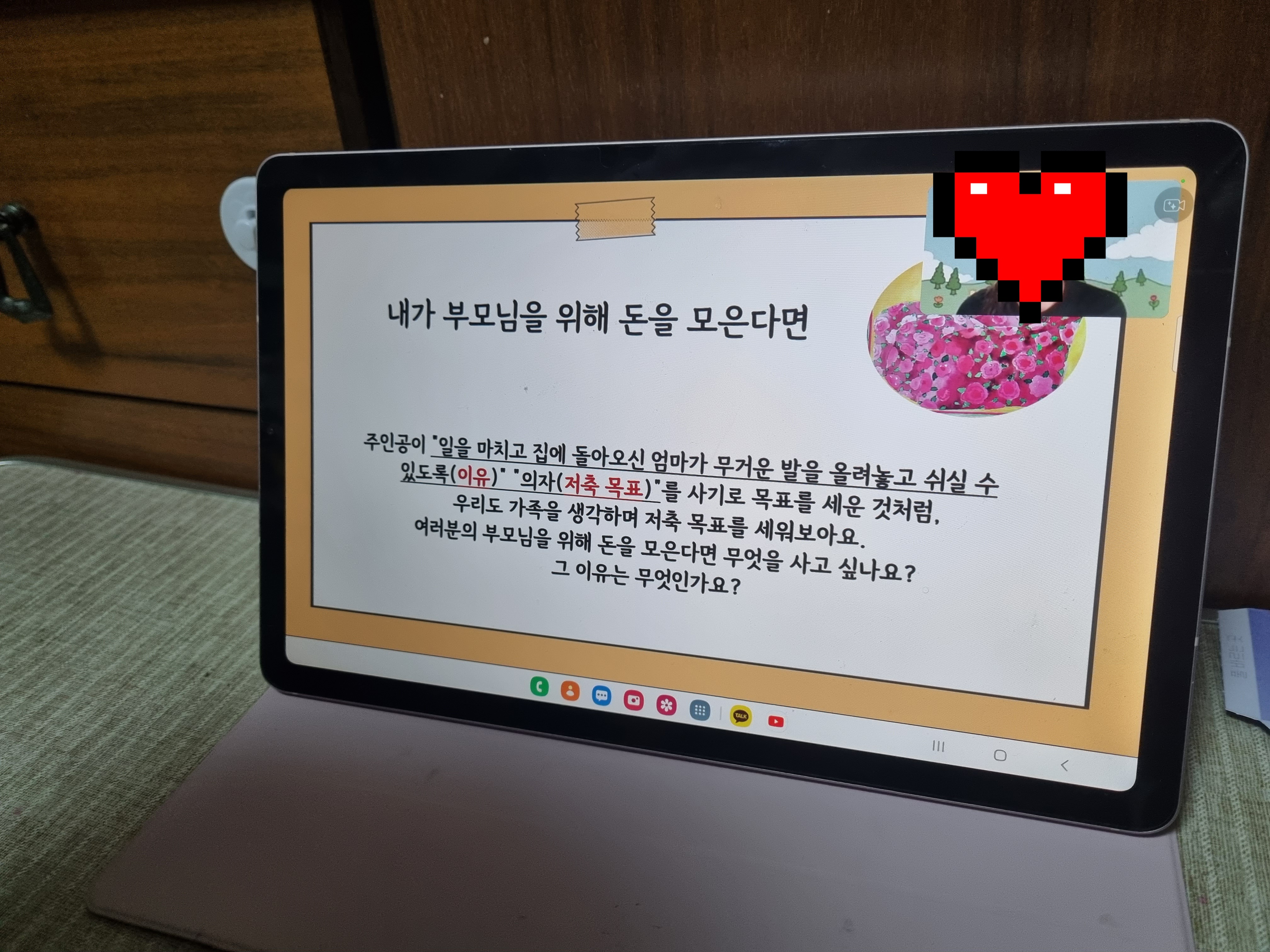 이번에는 용돈을 모아서 저축해서 가족 누구에게 무엇을 선물하고 싶은지 말해보는 시간이었는데요. 아이가 엄마에게 ‘커피머신’을 사주고 싶다고 했어요.