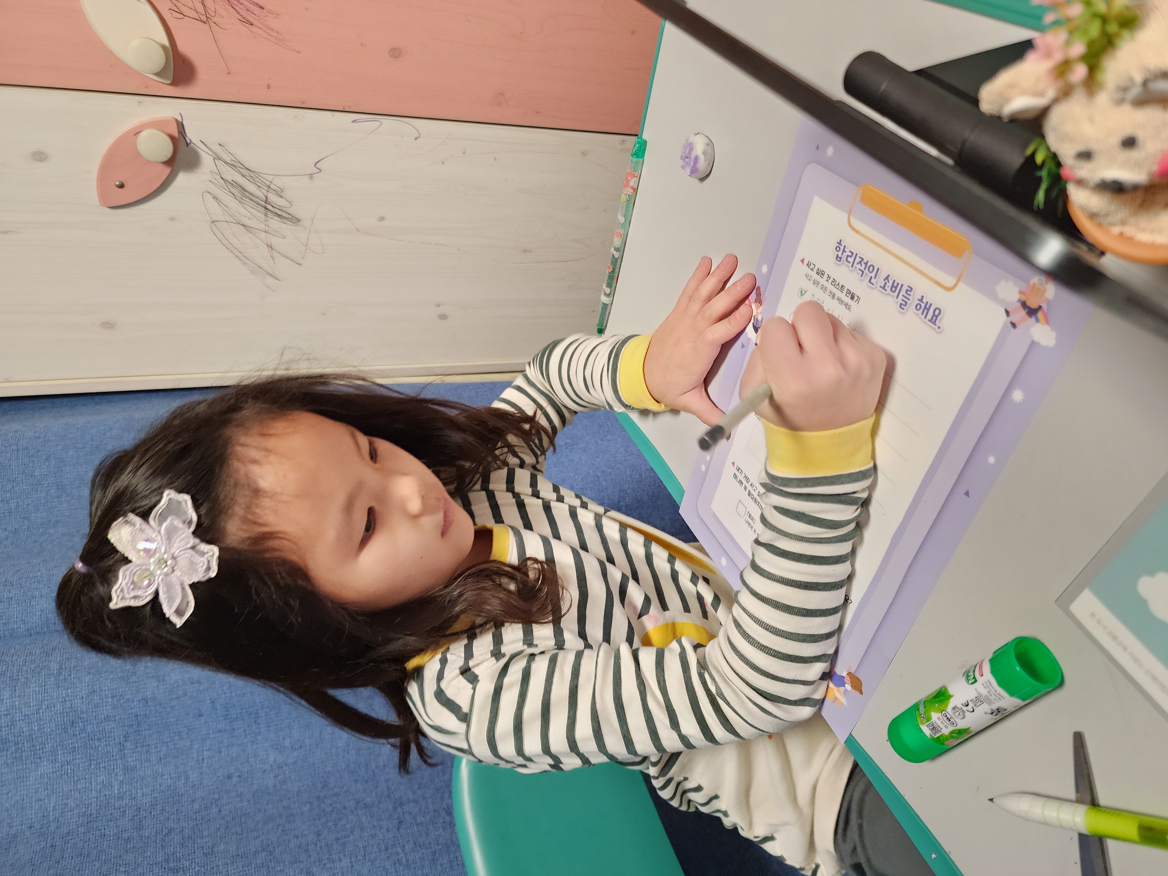 합리적인 소비에 대해서 배우고, 꼭 필요한 물건을 써보며, 소비에 대한 나름의 기준이 생긴것 같아서 기특했어요. 소박하게도 학교에서 쓰는 테이프를 다 썼다며 테이프를 1순위로 꼽더라고요~ 시장조사까지는 못해봤지만, 갖고싶어하던 슬라임을 말하지 않아서 만족스러웠어요.