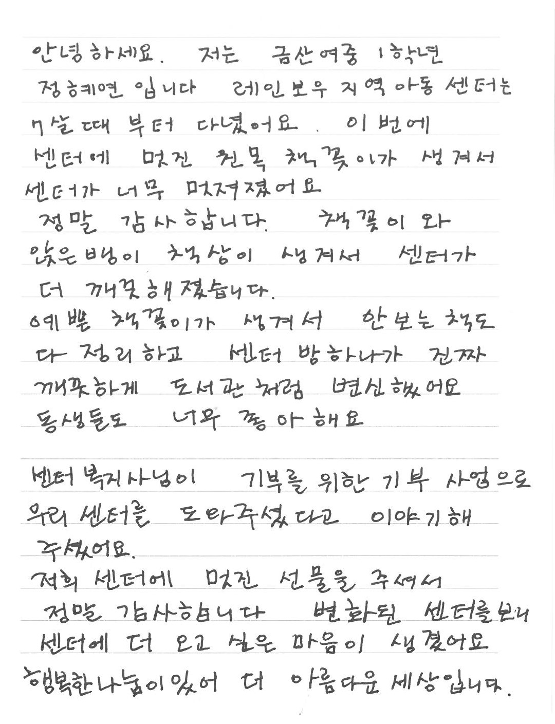 나눔 활동에 대한 센터 아동의 감사 인사도 전달 받아 더 특별한 나눔 활동이 아니었나 싶습니다.