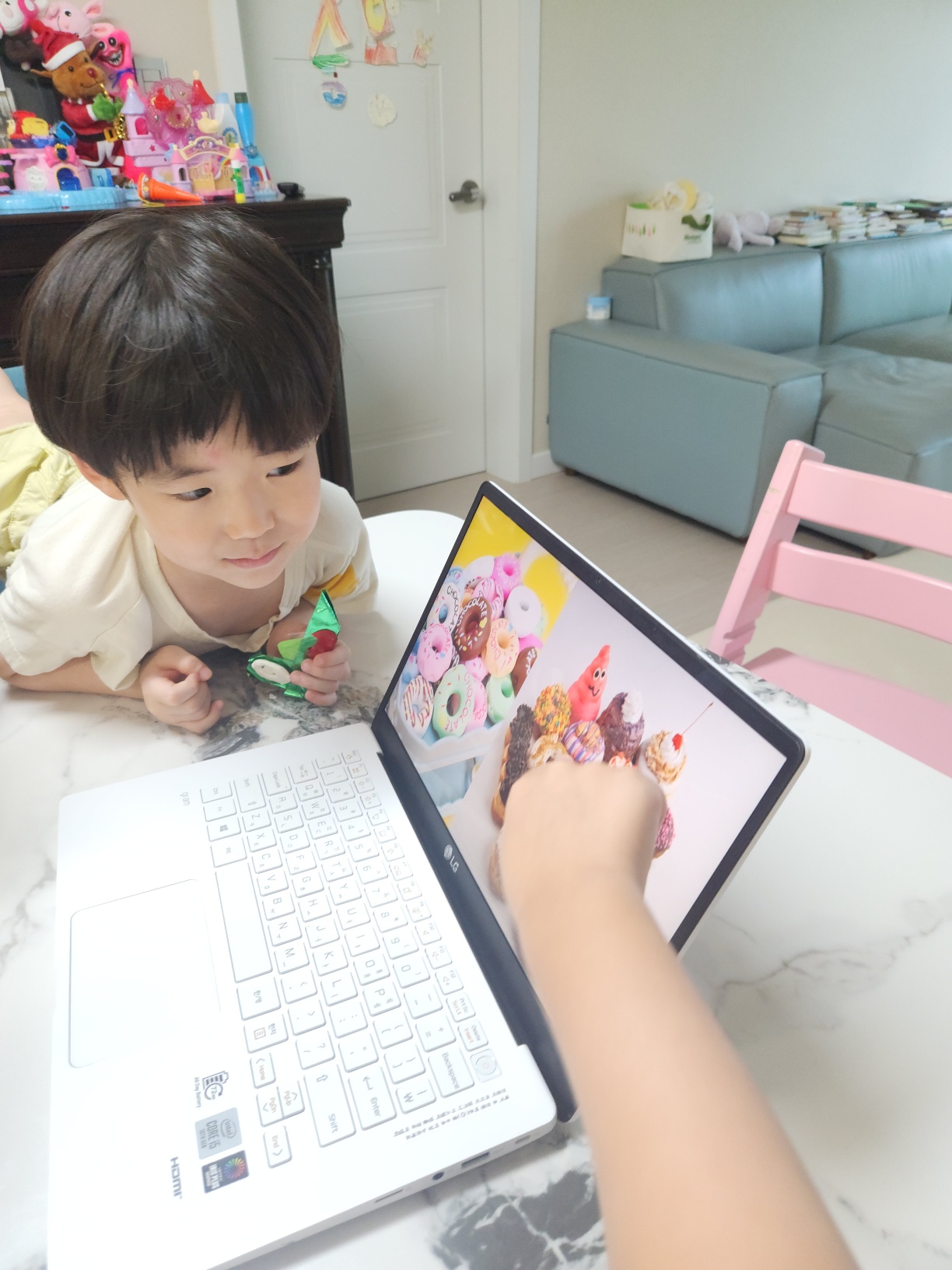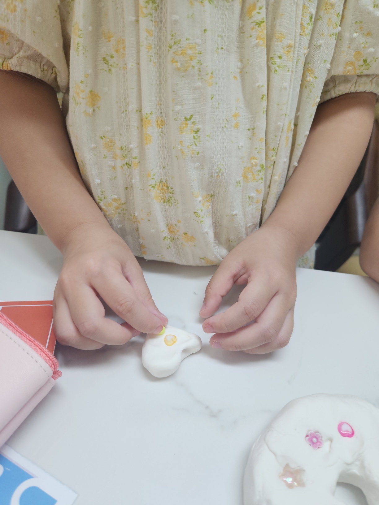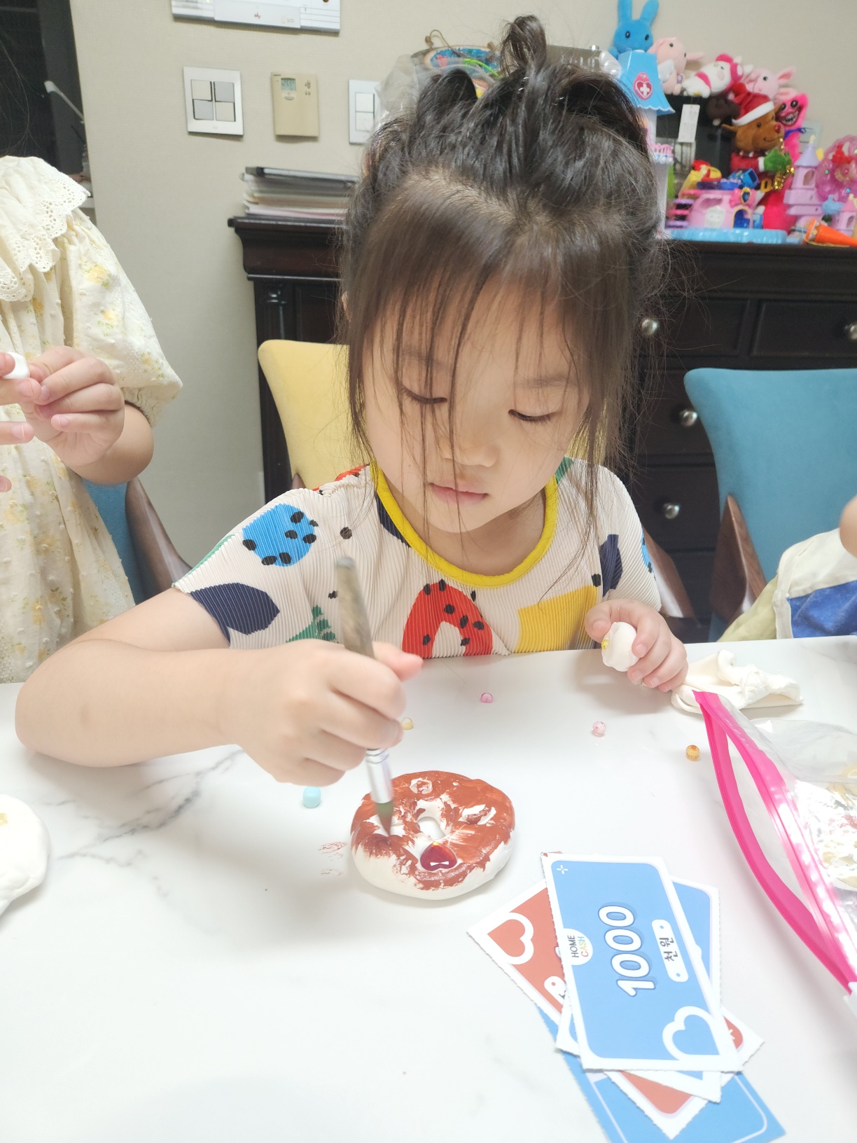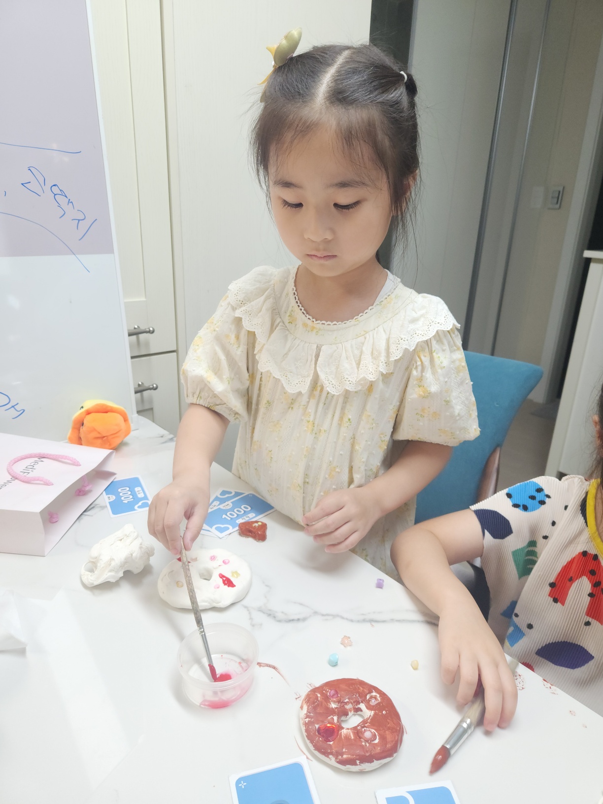 도넛의 맛도 중요하지만 디자인도 중요하다는 사실을 알려주고 예쁜 도넛 사진을 다양하게 보여주니 아이들이 물감을 활용해 예쁘게 색칠하고, 비즈 토핑을 재료로 구입했으며 다양한 제철과일을 올린 도넛을 만들기도 했습니다.
