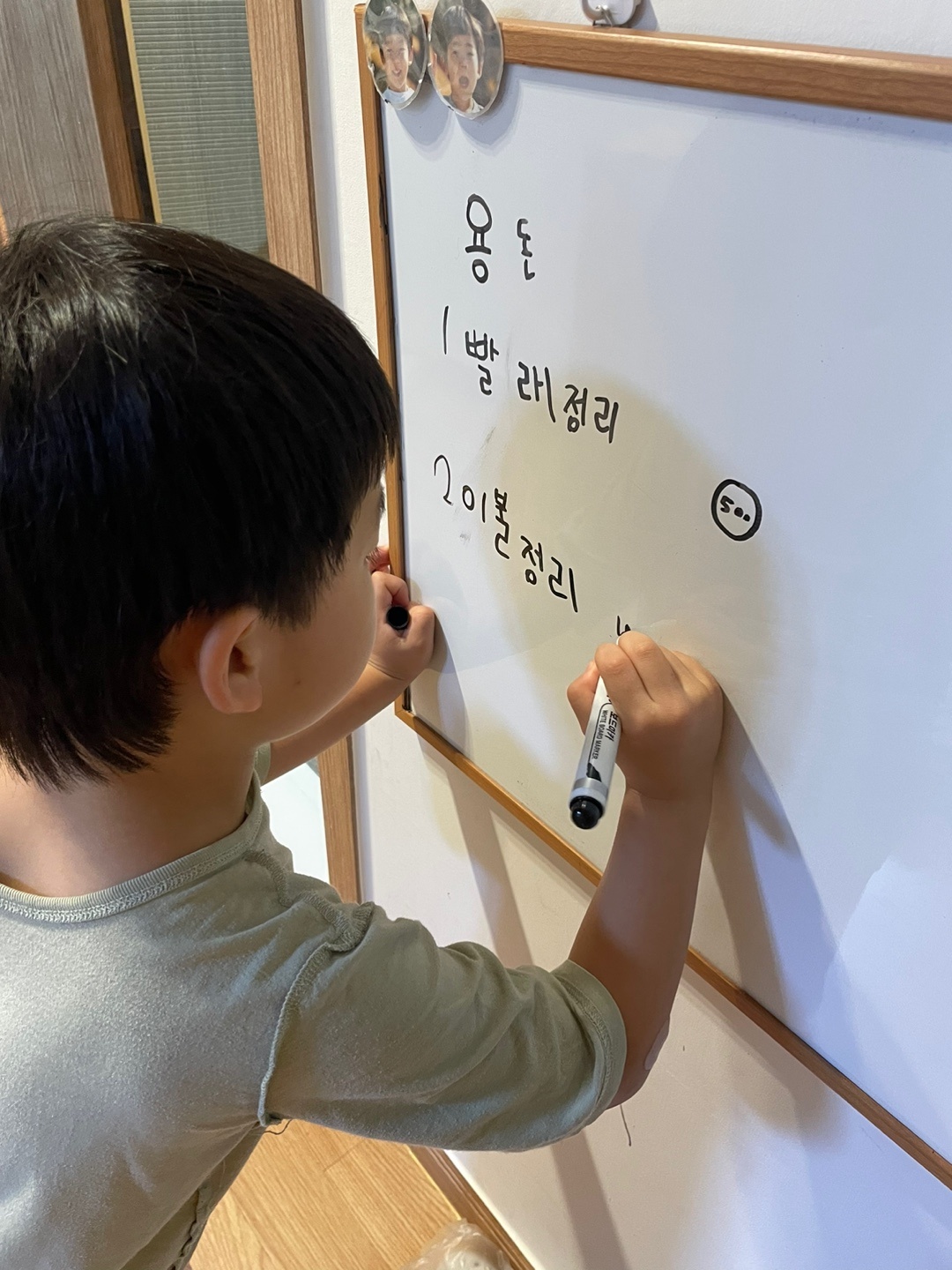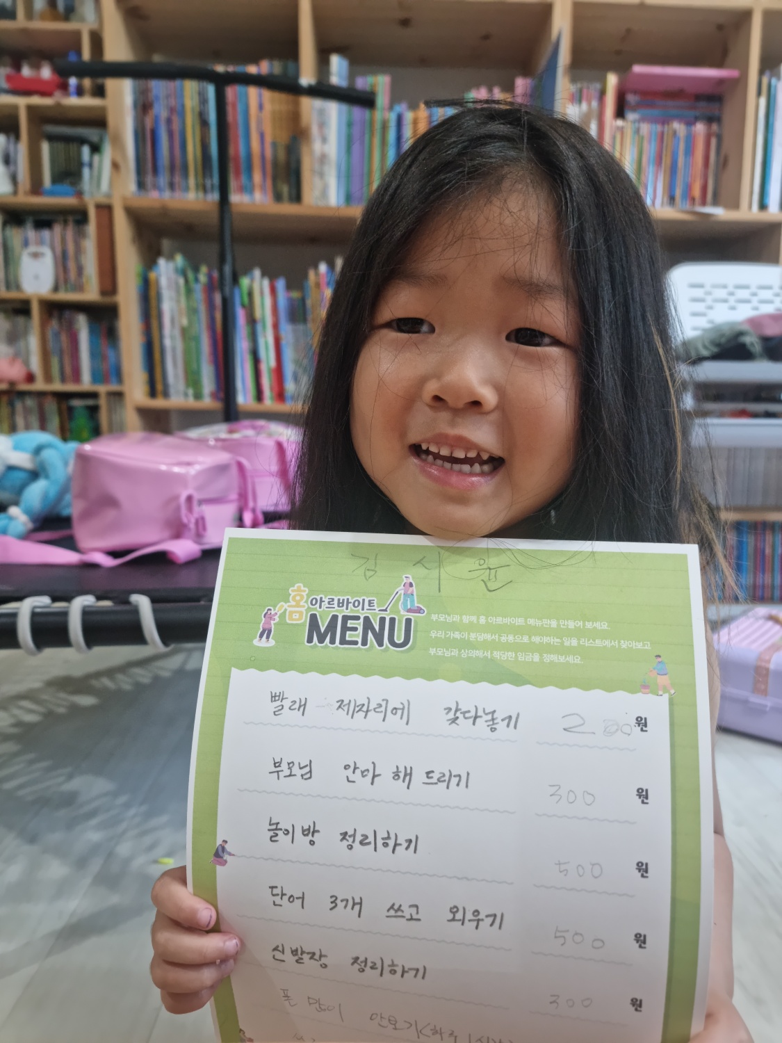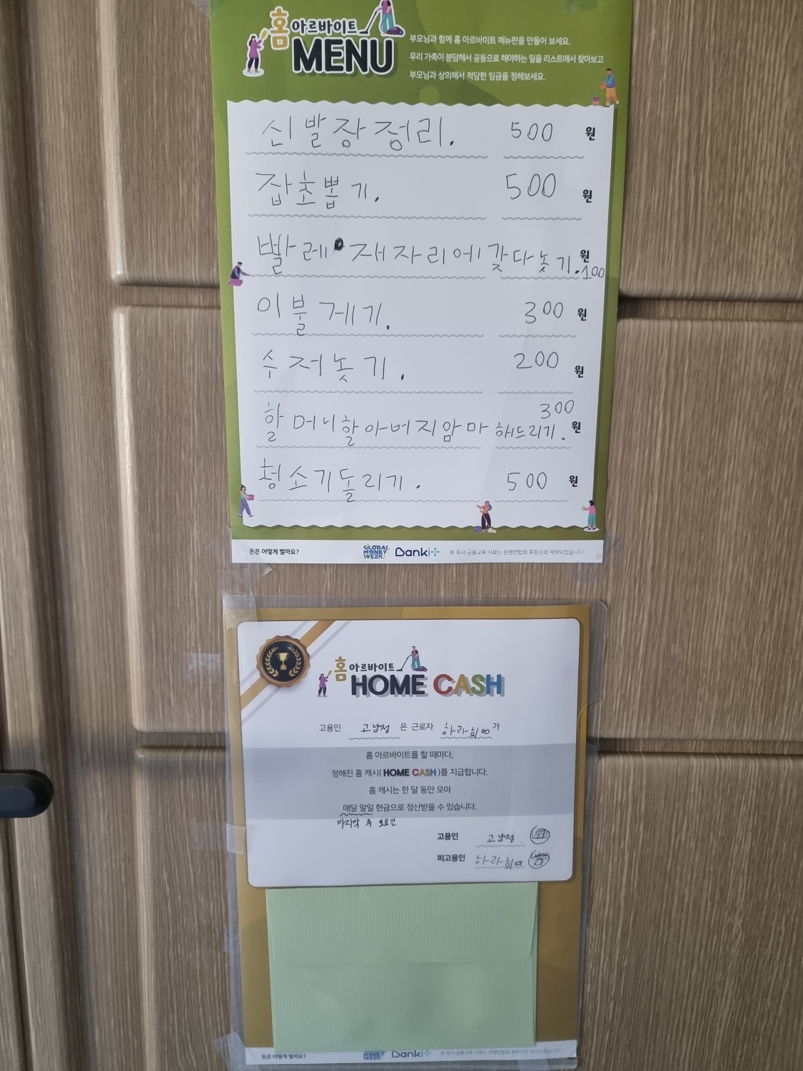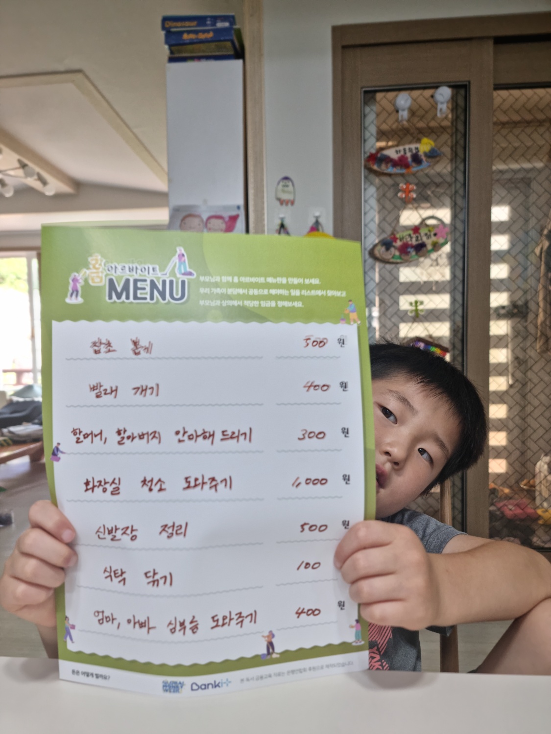 자기가 할 수 있는 것들을 적은 아이들. 생각보다 돈을 많이 책정하거나 적게 책정한 일의 경우 중간에 다시 용돈 가격을 변경하기도 했답니다. 방문에 붙여주니까 확실히 아이들일 홈아르바이 메뉴가 보일 때 마다 읽어보더니 일을 하네요. 교육 들으면서 주신 팁을 활용했더니 아이들이 부지런히 홈아르바이트를 합니다.