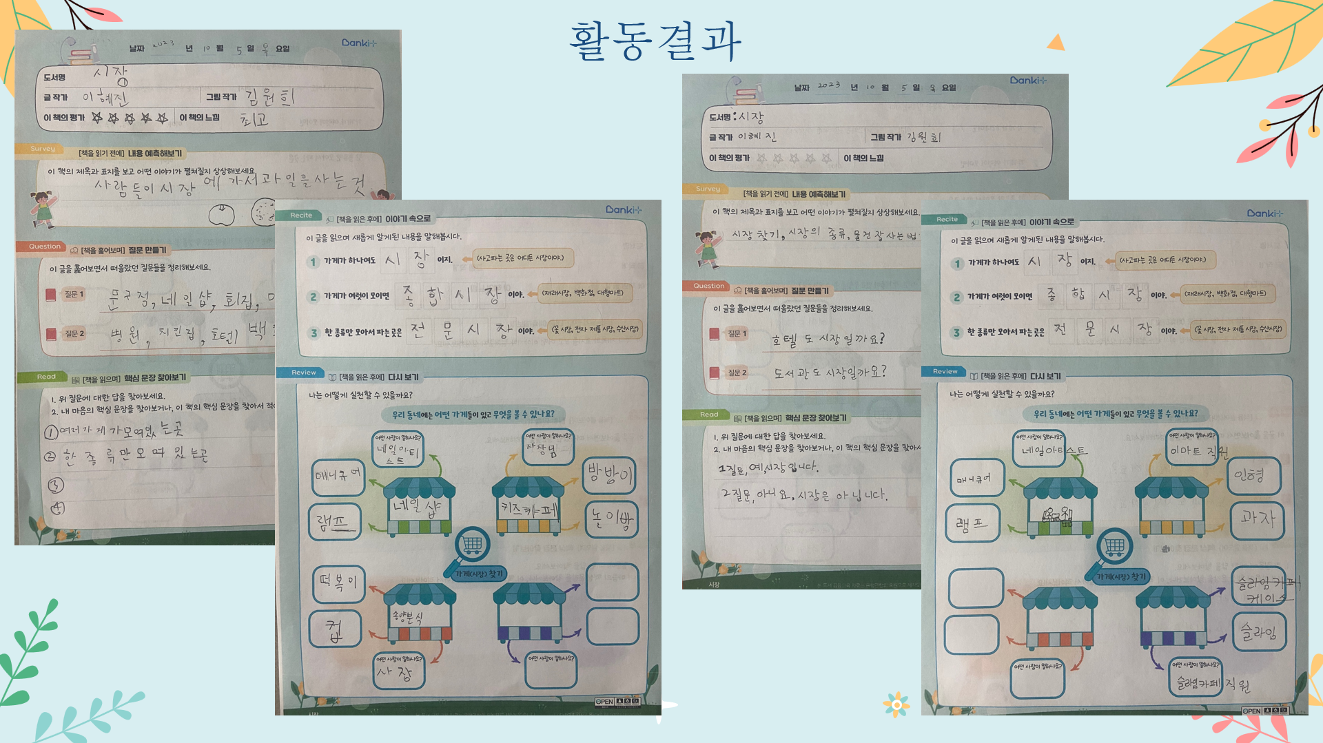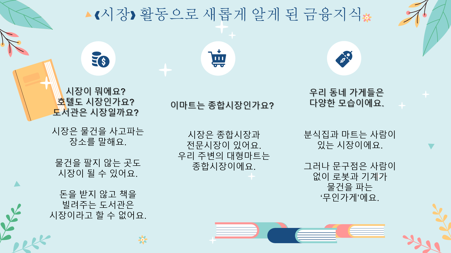 독후기록지를 처음 작성해보는 친구들도 많아서 제목부터 작가、 평점을 쓰는 방법까지 하나하나 알려주어야했지만 친구들이 생각보다 차분히 잘 따라주었습니다。활동지 질문에 생각을 정리하여 적는 일에 익숙하지 않은 친구들도 있었지만 자신의 생각을 자유롭게 발표할 기회를 주었더니 다른 친구들의 이야기를 듣고 금방 적응하여 활동지를 채워나가는 기특한 모습을 보여주었어요~첫째 날 활동은 우리 주변의 다양한 시장과 가게의 모습에 대해 정리해보고 마무리를 지었습니다。