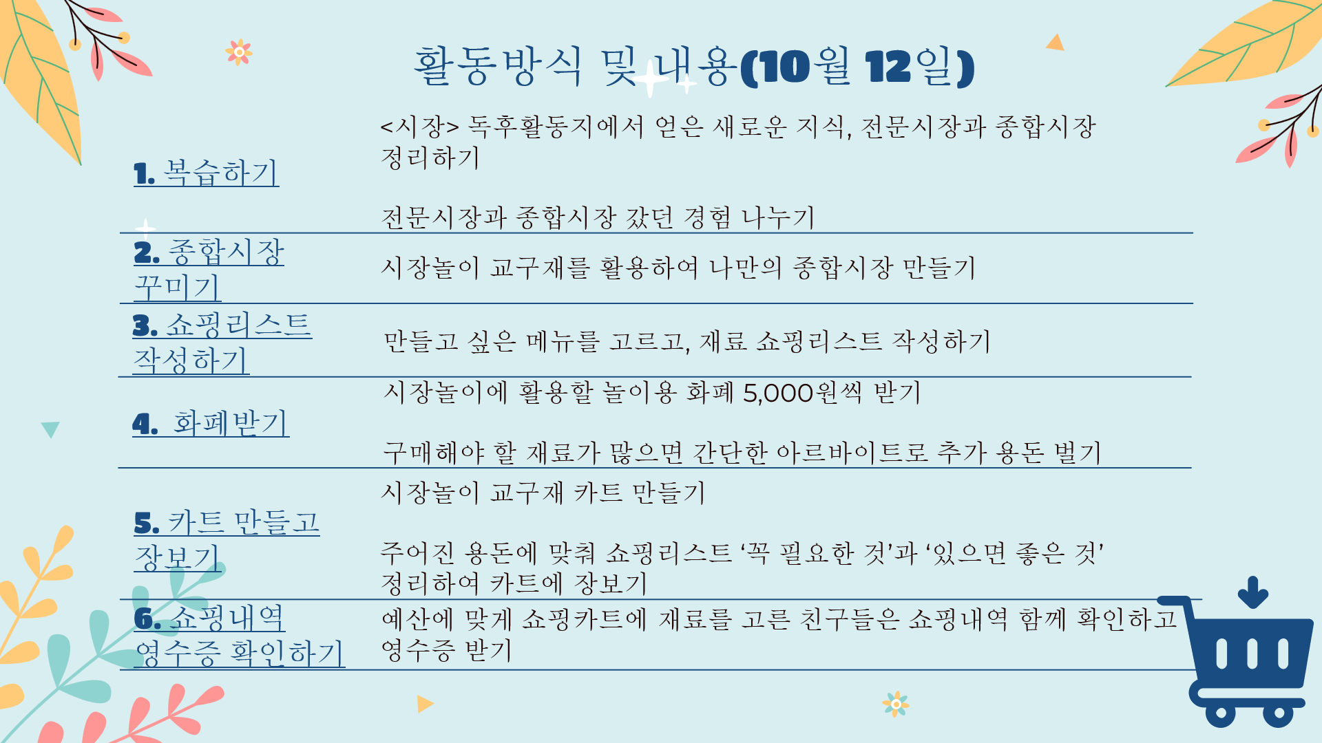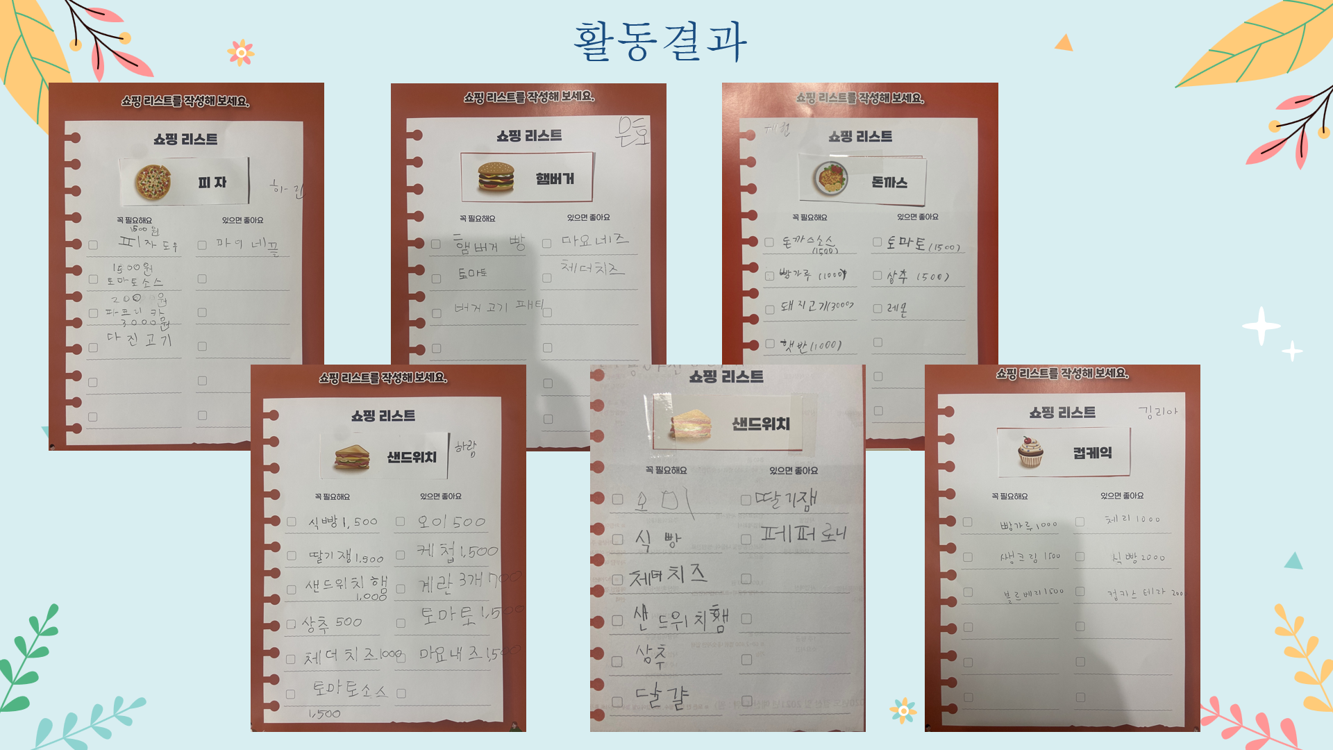 둘째 날은 자신만의 종합시장을 만들고 직접 장을 보는 시장놀이를 진행했습니다。 친구들이 초등학생인 만큼 덧셈이 가능해서 쇼핑리스트 총액을 계산하여 예산에 맞게 목록을 정리하는 활동을 추가했습니다。