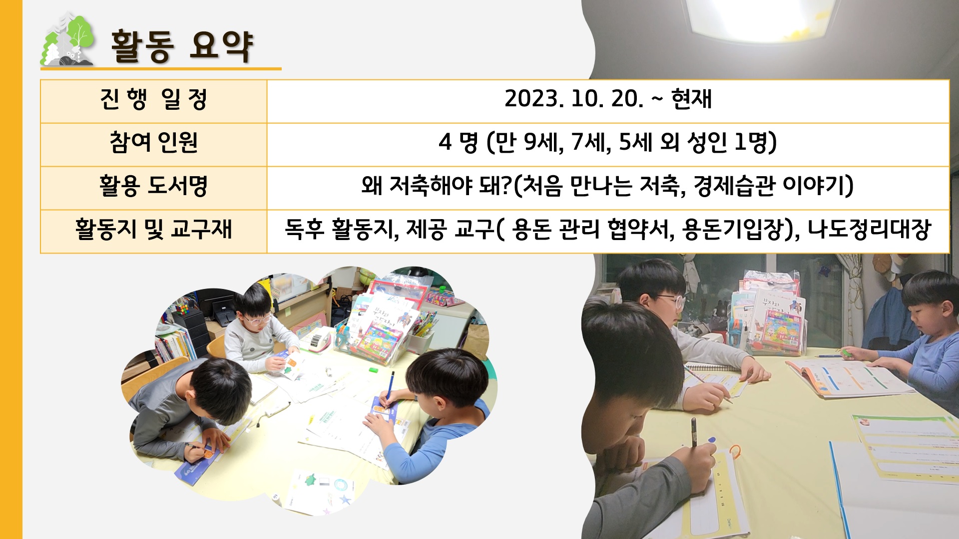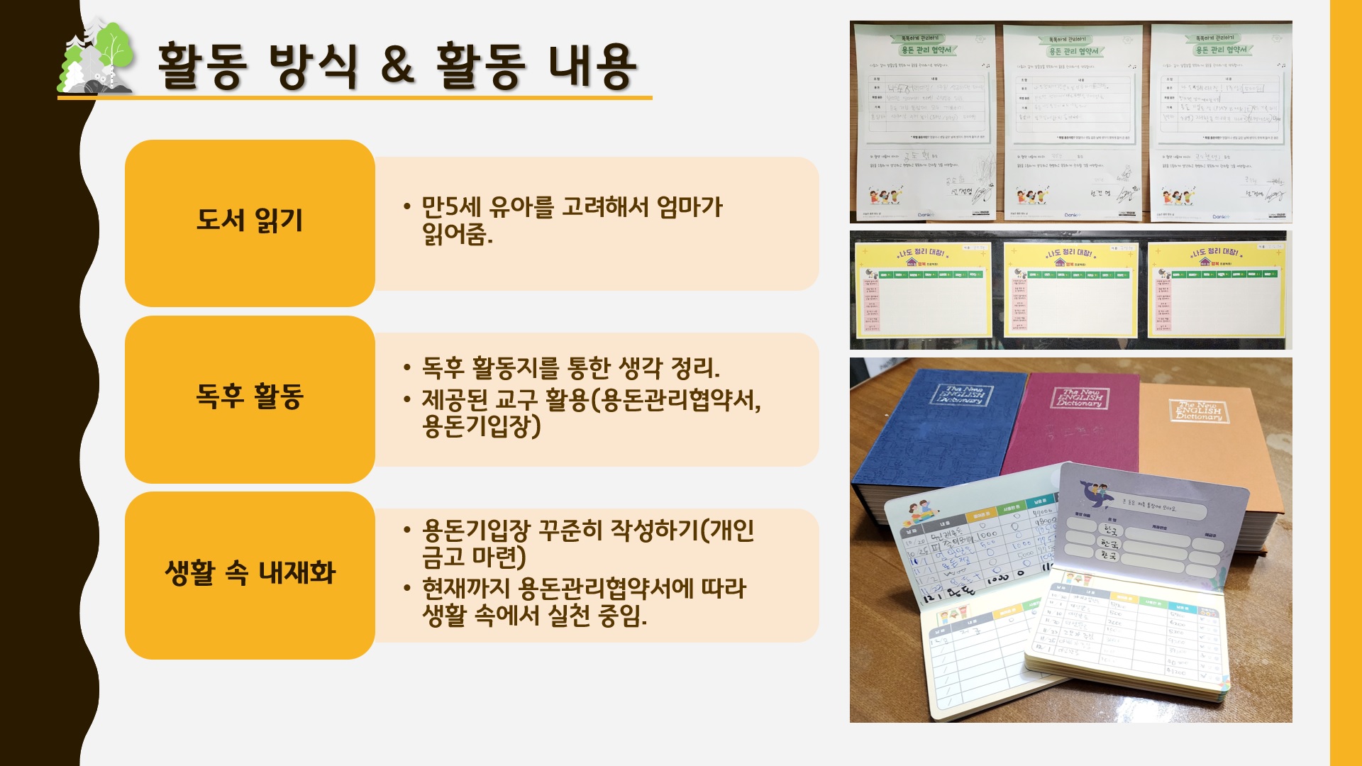 이후 용돈관리협약서를 작성하였는데, 우선 정리습관을 기르기 위해 진행하고 있었던 인센티브 규칙을 용돈협약서에 반영하기로 하엿습니다. 또한 홈알바를 각 연령에 맞게 정한 다음 일주일마다 1천원의 용돈이 생길 수 있도록 큰 틀을 짜 보았습니다. 실제 모든 준비물과 간식을 가정에서 모두 제공하고 있는 상태라 용돈의 필요성이 간절하지는 않습니다. 스스로 계획하고 결정하며 돈을 운용해본 경험이 많이 부족하므로 이를 위한 첫 단추를 끼운다는 생각으로 진행하고 있습니다. 다만 친인척들과 같은 어른들이 주시는 큰 용돈들은 기존처럼 부모님께 전달 후 은행에 바로 저축하는 것을 유지하였습니다.