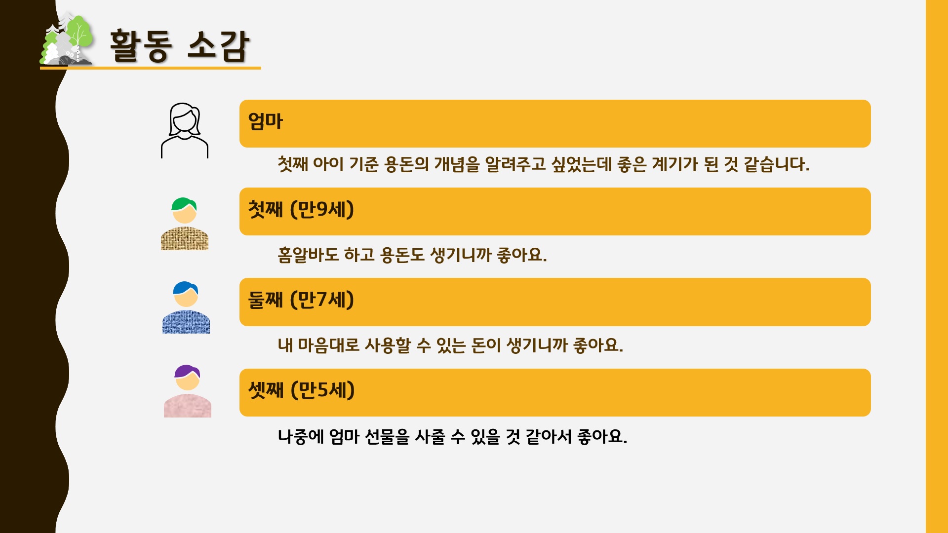 새로운 개념을 깨우치기 보다는 본인들 마음대로 운용할 수 있는 돈이 생겨서 좋다는 공통된 소감입니다. 거기에 덧붙여 막내는 엄마 사랑을 독차지 하려고 애교 멘트도 덧붙였답니다. ^^